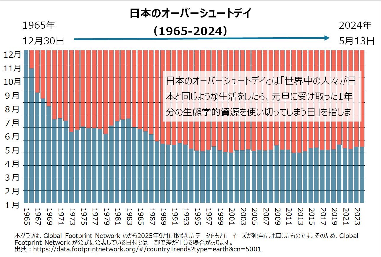 この傾向から、日本では「自然資源を使い果たす日」が年を追うごとに早まってきていることが確認できます。すなわち、より早い段階で「生態学的赤字」が発生する年が増えているということです。